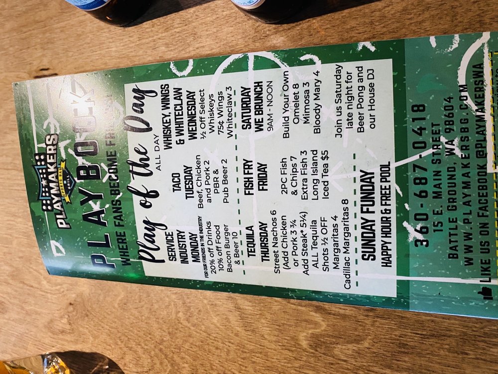 Playmakers Sports Bar & Grill, located in Battle Ground, WA, is a vibrant spot that caters to pizza and American cuisine enthusiasts. With a wide range of amenities such as delivery, takeout, reservations, and outdoor seating, it's a versatile dining destination. The menu features unique dishes like Alarm Chipotle cream pizza and Bacon Jam Stuffed Cheese Bread, along with a diverse drinks selection including craft beers and cocktails. Customers praise the attentive service and flavorful food, with standout items like the Bacon Wrapped Prawns and BBQ Chicken earning rave reviews. The cozy ambiance, great beer selection, and delicious desserts add to the overall experience. Boasting a true sports bar atmosphere, Playmakers Sports Bar & Grill is a must-visit for a satisfying meal and fun hangout.
